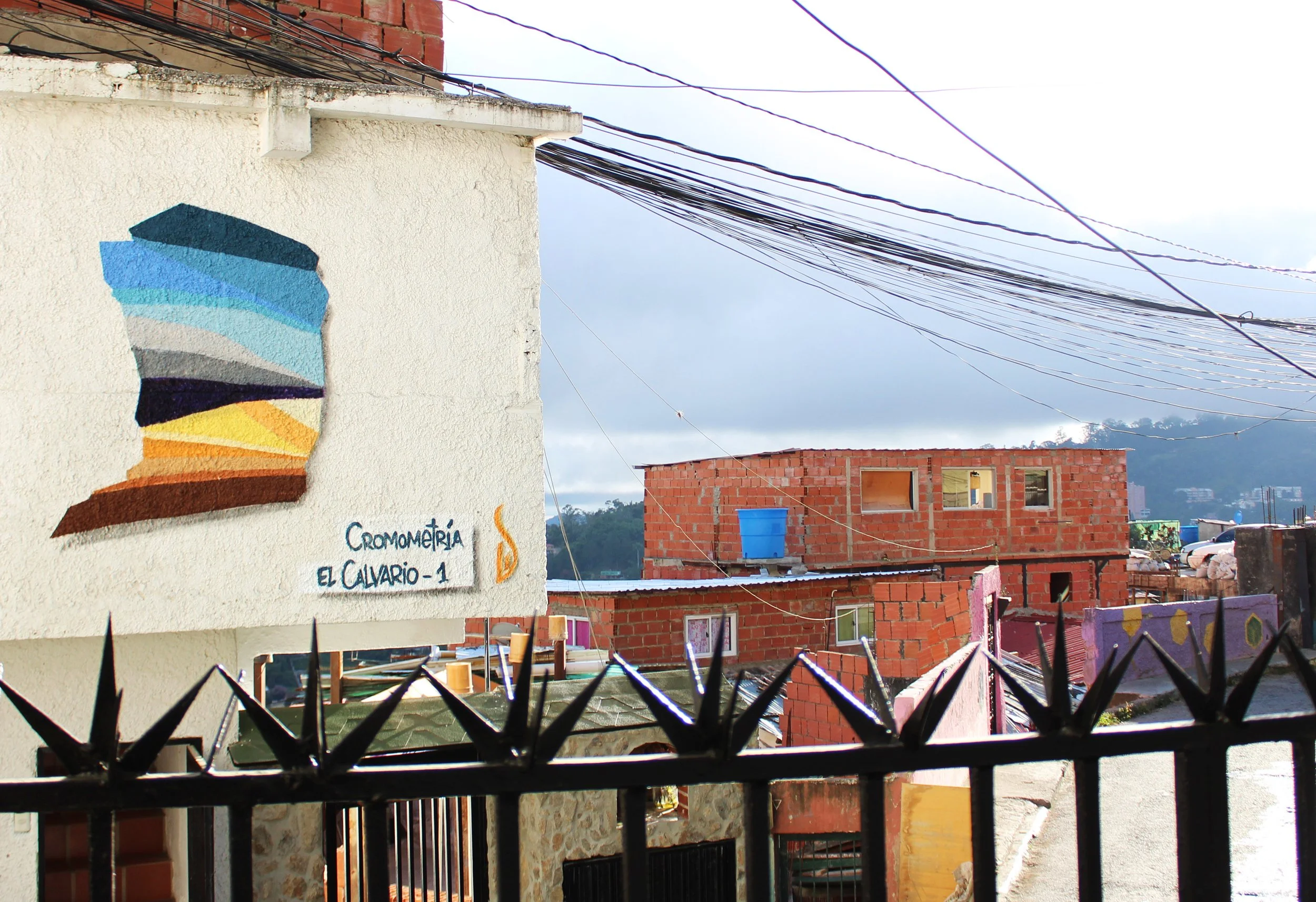 An essential factor in lé dieguê’s career is his community work. In 2018, after painting various murals for the community of El Calvario in Caracas, he wanted to paint one more piece that could be more representative of the area. For that, he decided to paint Chromometry El Calvario 1, a piece inspired by a picture of a gap between the buildings in the adjacent alleyways. In that way, he invited the community to look beyond their surroundings. Giving a novel way to see light and color, creating a new bridge for them to connect with art and their own community.